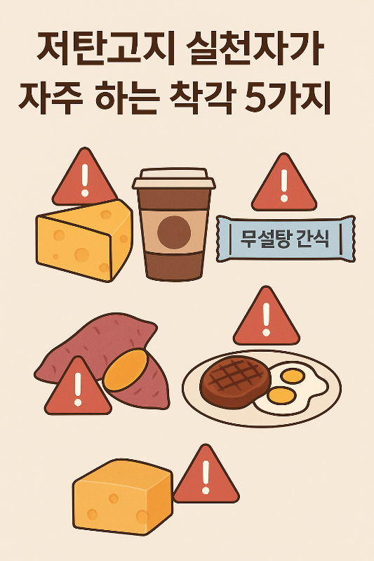 저탄고지를 실천하다 보면,처음엔 “탄수화물만 줄이면 되지!”라고 생각합니다.하지만 꽤 오래 실천한 사람들조차‘이건 괜찮겠지’ 하고 선택한 것들이사실은 정체기의 원인이 되는 경우가 많습니다.오늘은 저도 한때 했던,저탄고지 실천자들이 흔히 하는 착각 5가지를 정리해볼게요.지금 내 식단도 한번 점검해보세요.❌ 착각 1. “탄수화물만 안 먹으면 다 괜찮아”✔ 실수: 탄수화물만 신경 쓰고 지방·단백질 비율은 무시닭가슴살만 먹거나, 샐러드에 기름 없이 먹는 경우👉 결과: 배고픔 → 폭식 → 혈당 스파이크✅ 해법:지방을 적당히 섞어 포만감을 유지해야 케토시스 유지 가능❌ 착각 2. “고기랑 치즈는 무제한 먹어도 된다”✔ 실수: 고지방 고단백 = 고칼로리 폭탄지방 + 단백질을 무한대로 먹으면→ 인슐린은 낮지만 체지방..